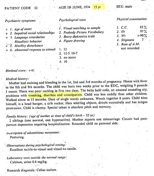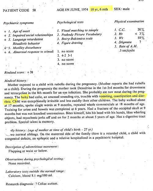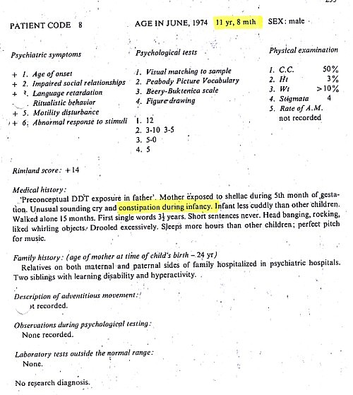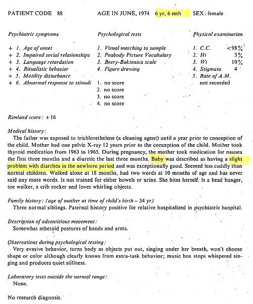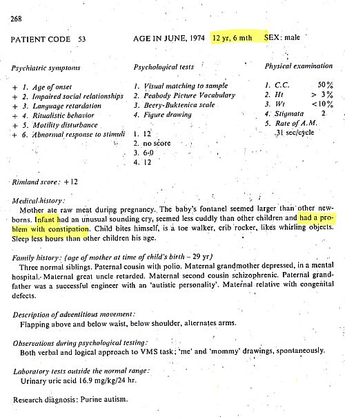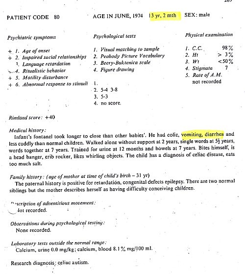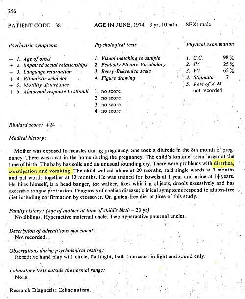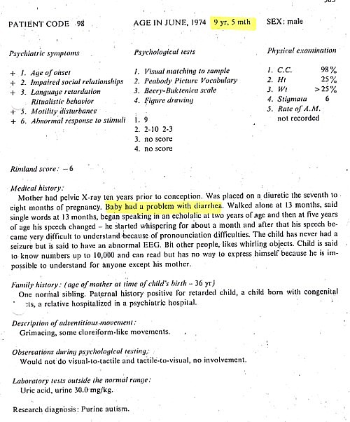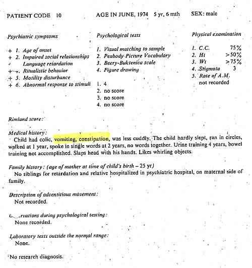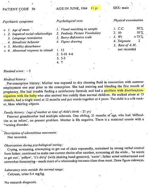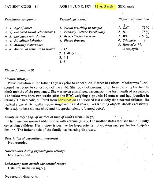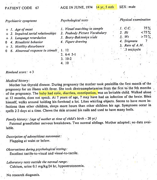 Patient information gathered Brian Deer from The Autistic Syndromes, edited by Dr Mary Coleman, published in 1976. Seventy-eight autistic children with a median age of 9 – were examined at the Children’s Brain Research Clinic in Washington DC, each accompanied by a developmentally normal child of the same age and sex. Patients and controls came in special buses, each delivering groups of four children to the clinic, in the week of June 24-28 1974.