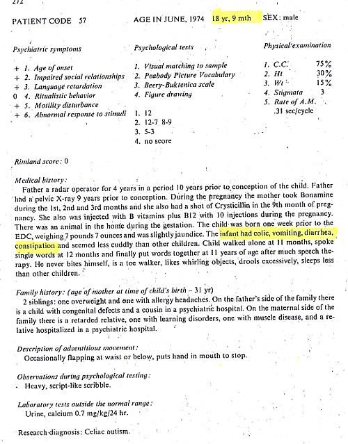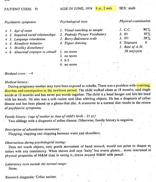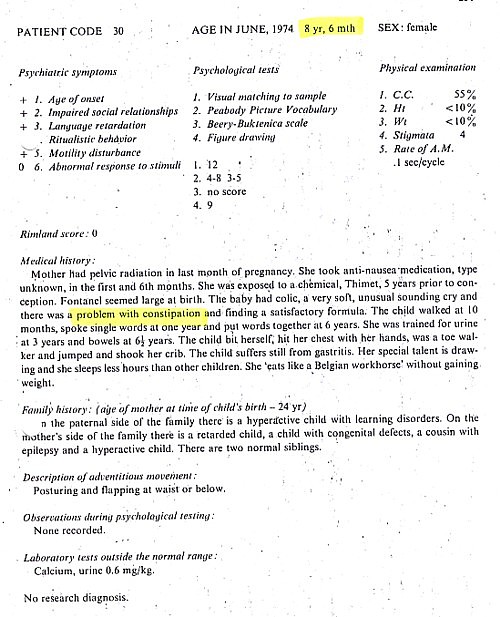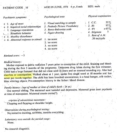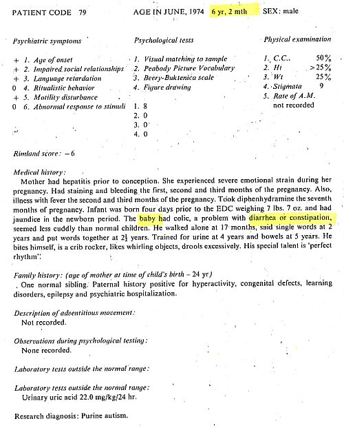 Coleman’s interests focused on identifying different types of autism, but study of her data today – including the children’s ages and the onset of any gastric problems – reveals a disproportionate incidence of bowel problems in autistic children before the MMR vaccine was even licensed in the US. Coleman’s meticulous study reports that “the presence of constipation or diarrhea in 19 of the autistic patients and only 5 of the control children during the newborn period was significant”. As can be seen from the ages reported in the histories, many of these children’s bowel problems began in the 1960s.